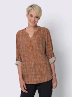 Ce chemisier à manches courtes doit son look original à son joli motif à rayures structuré. Col chemise avec V ouvert et patte de boutonnage sur toute la longueur. Poche plaquée légèrement arrondie. Coutures de séparation et pinces poitrine pour une coupe parfaite, mélange de coton pour un confort extrême.