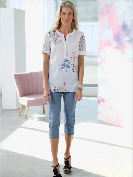 Joli chemisier au motif floral. Chaque pièce est unique ! Encolure arrondie avec petit V et paillettes brillantes transparentes. Pinces poitrine pour une coupe parfaite. Boutons brillants et manches 3/4 retroussables tendance.
