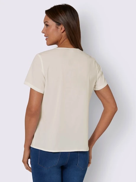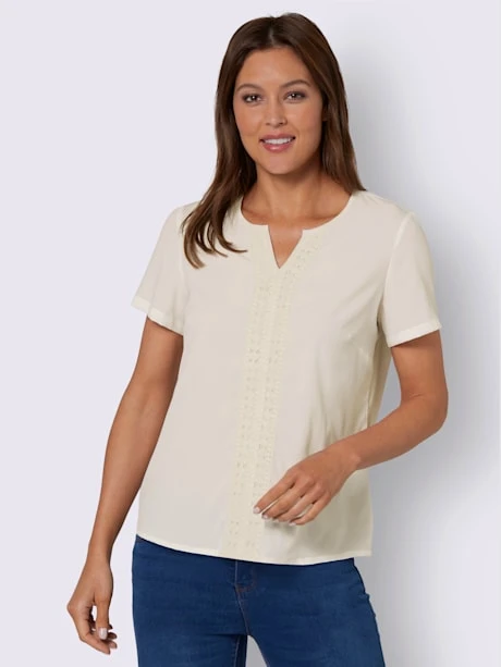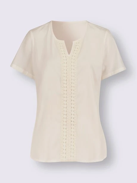 Ce chemisier léger doit son look fantaisie et féminin à sa large bordure décorative en dentelle au centre devant. Encolure ronde et en V combinée soigneusement passepoilée. Pinces poitrine pour une coupe parfaite.