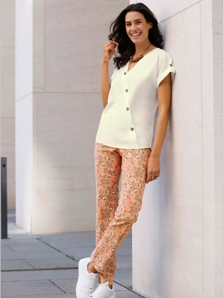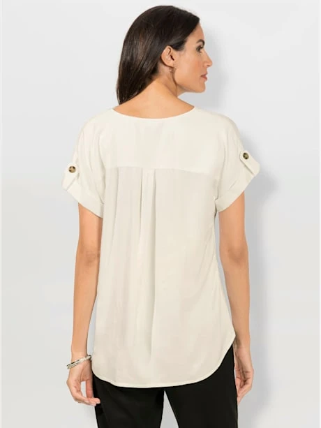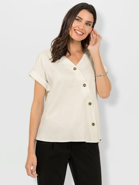 Ce chemisier en viscose douce et fluide aux reflets discrets fait partie de nos pièces favorites. Raffiné, il dévoile un style cache-cœur avec des boutons fantaisie en imitation corne. Mancherons et manches longues avantageuses avec revers fixe et bride fantaisie au bas des manches. Au dos, des épaulettes et un pli pour une largeur agréable et une base plus longue et arrondie.
