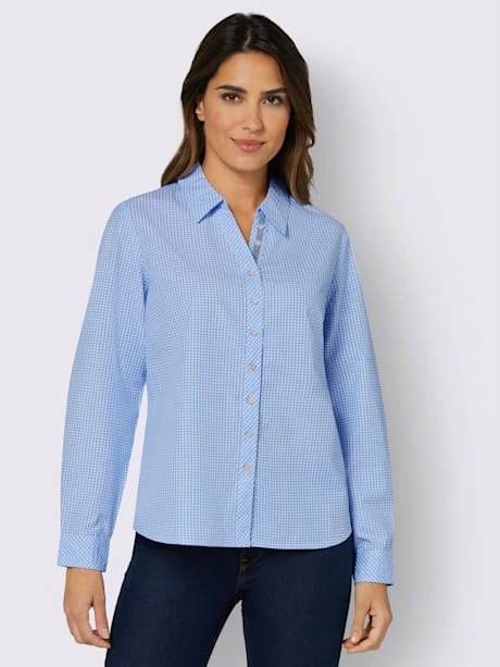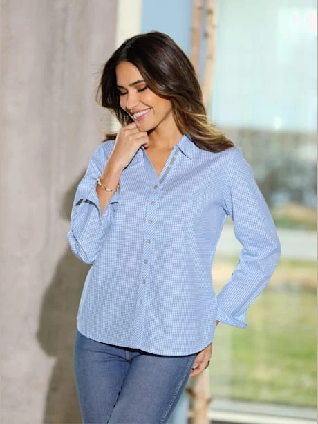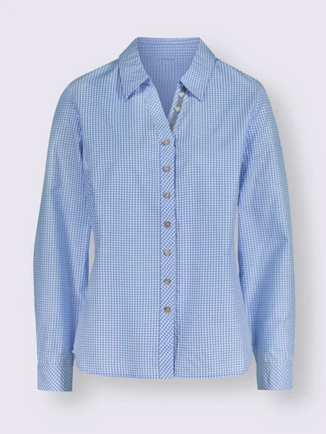 Chemisier à carreaux Vichy. Élégants boutons en forme de cœur et ruban orné d’éléments traditionnels. Col chemise, V ouvert et ourlet légèrement arrondi. Pinces poitrine structurantes. Manches longues à manchettes boutonnées.