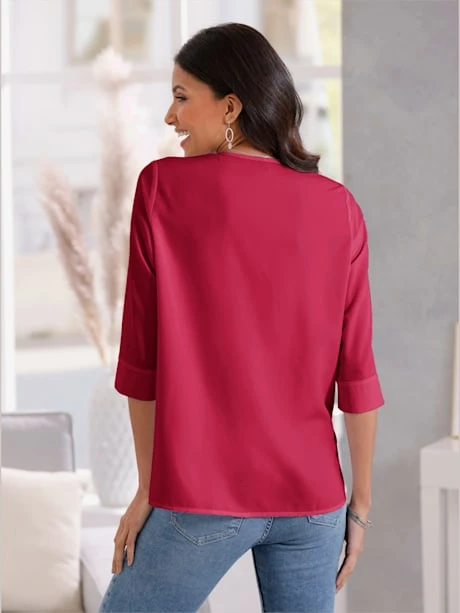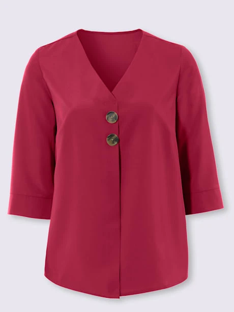 Tunique flatteuse ! Son encolure en V affinante légèrement chevauchante se prolonge par un pli flatteur devant, mis en valeur par des boutons imitation bois. Manches 3/4. Ourlet avec dos plus long et fentes sur les côtés.