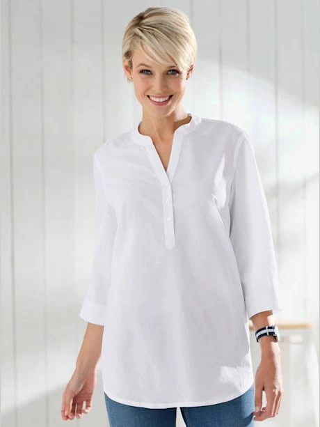 Chemisier basique facile à assortir ! Encolure en V et patte de boutonnage. Manches 3/4 à manchettes.