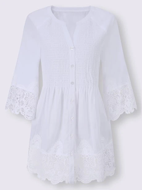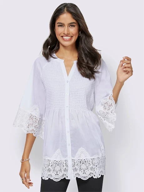 Chemisier avec empiècement en dentelle devant à l`ourlet et aux finitions des manches raglan légèrement évasées. Encolure ronde avec petit V et patte de boutonnage sur toute la longueur. Légers plis devant, sous les empiècements smockés, pour un tombé flatteur.