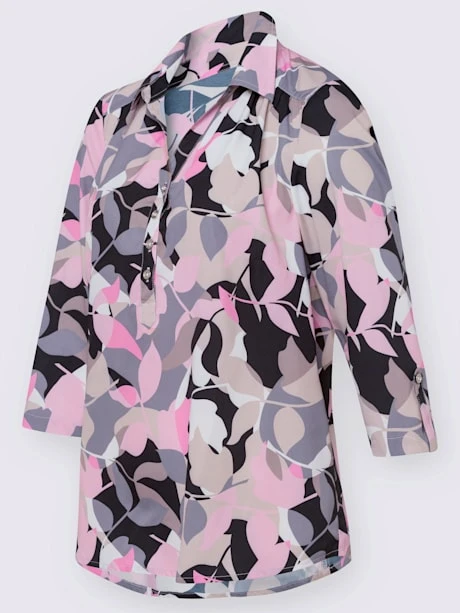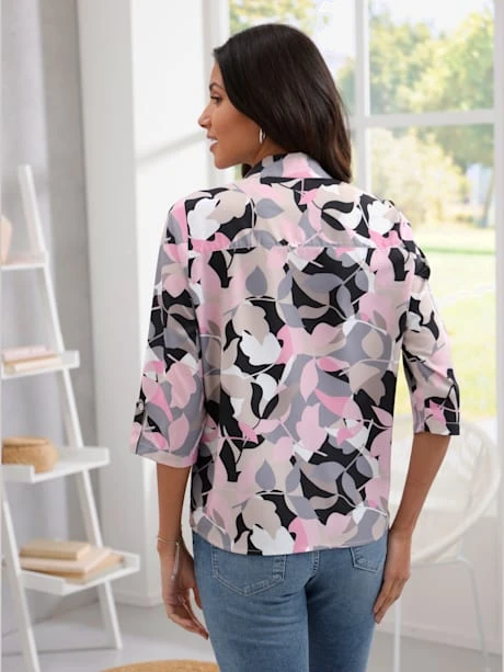 Superbe chemisier en qualité crêpe imprimée. Col chemise à petit V et patte de boutonnage courte. Manches 3/4 tendance à faux revers. Ourlet légèrement arrondi pour un port à l’intérieur ou à l’extérieur.