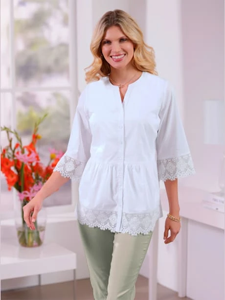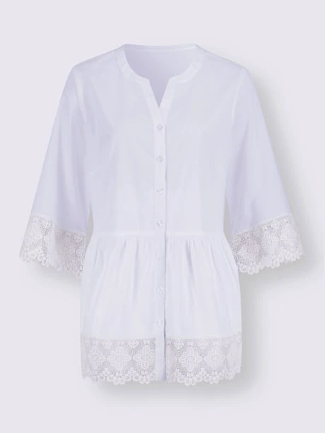 Ravissant chemisier en dentelle à la coupe longue flatteuse. Encolure ronde avec V ouvert et patte de boutonnage. Dentelle romantique aux manches 3/4 évasées et à l’ourlet devant.