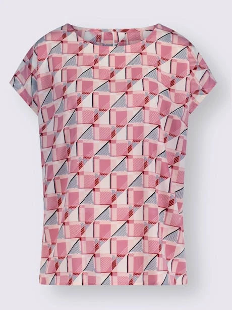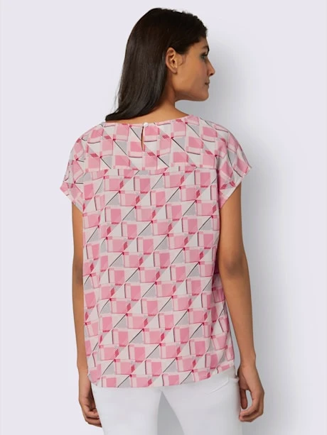 Chemisier au motif graphique facile à enfiler en qualité crêpe. Encolure ronde avec fente et bouton au dos, mancherons et manches courtes tendance. Ourlet légèrement arrondi au dos.