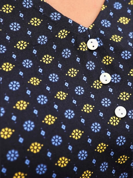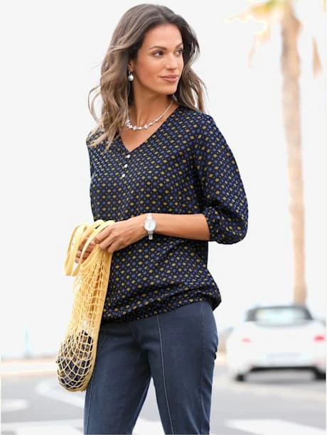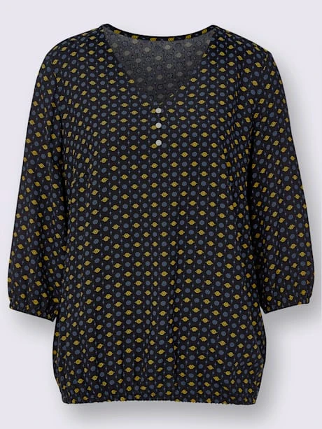 Chemisier incroyablement doux orné d`un motif imprimé minimaliste tendance. Encolure en V et petite patte de boutonnage décorative. Bords-côtes élastiques aux manches 3/4 et à l`ourlet pour un effet affinant.