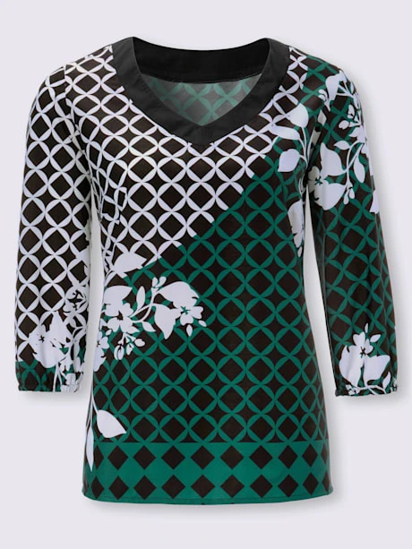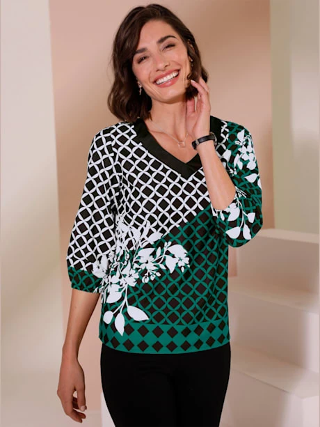 Chemisier au superbe mélange de motifs graphiques et floraux. Encolure en V affinante. Élastique aux manches 3/4.