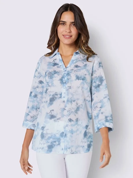 Chemisier tendance et agréable à porter imitation batik. Col chemise ouvert, patte de boutonnage courte et manchette fendue à la finition des manches 3/4.