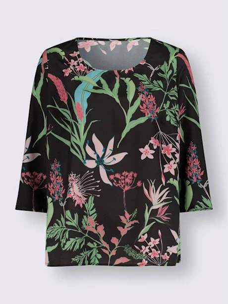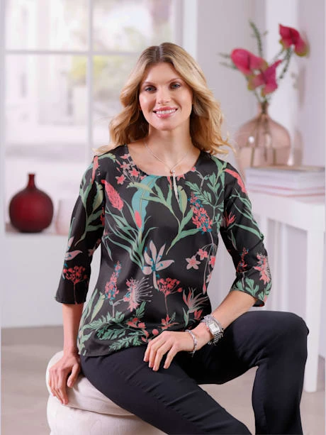 Effet de couleur différent pour chaque pièce ! Chemisier au motif floral tropical. Encolure ronde et manches 3/4. Pinces poitrine et empiècement pour une coupe parfaite.