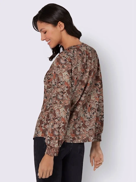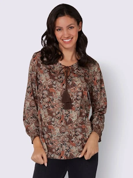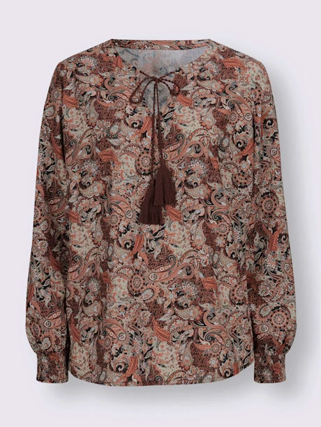 L’imprimé : magnifique. La coupe : très tendance. La qualité : très facile d’entretien. Ce chemisier avec motif paisley a tout pour plaire. Encolure ronde avec petit V et lien à nouer, pinces poitrine et finitions des manches smockées.