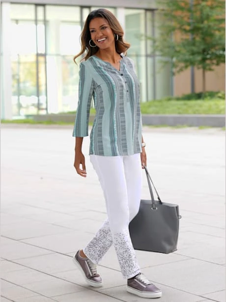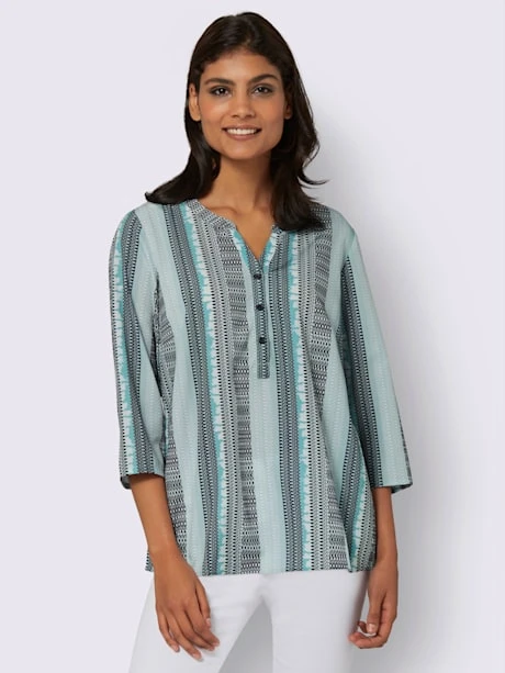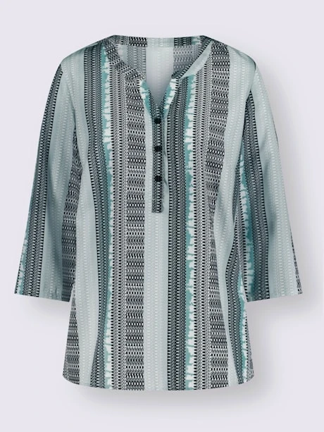 Joli chemisier en crêpe vaporeuse et divers imprimés à rayures verticales. Encolure ronde avec petit V et patte de boutonnage courte. Pinces poitrine structurantes, manches 3/4 et ourlet légèrement arrondi.