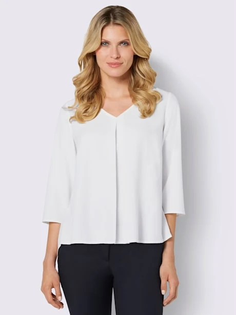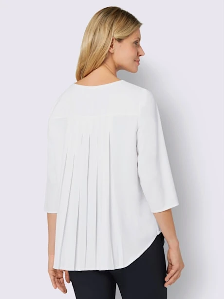 Offrez-vous ce chemisier plissé ! Pli creux sous l’encolure en V pour une largeur flatteuse. Dos avec plis décoratifs sous l’empiècement des épaules. Manches 3/4. Ourlet légèrement arrondi, plus long derrière.