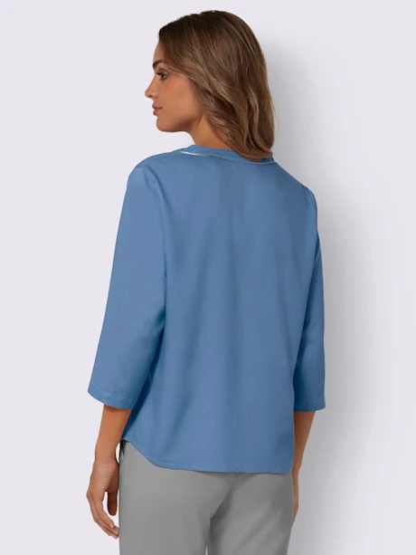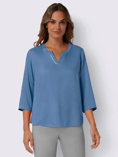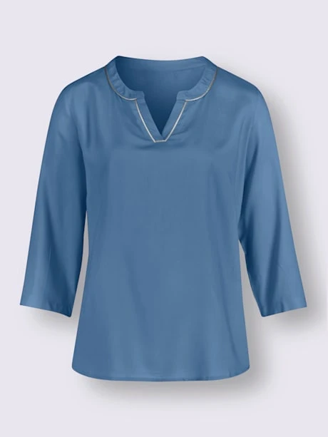 Chemisier en pure viscose douce pour les journées d’été chaudes. Encolure ronde avec petit V ornée de détails couleur argent brillants. Pinces poitrine, manches 3/4 et ourlet légèrement arrondi.