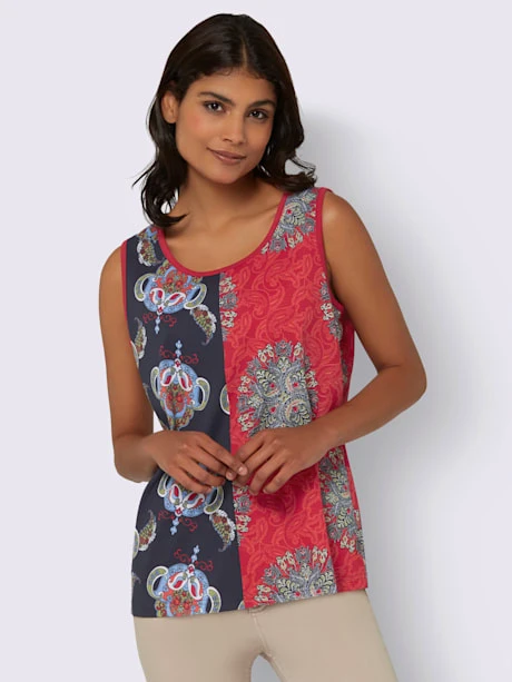 Ce débardeur associe 2 imprimés à un ravissant aspect patchwork. Encolure ronde. Qualité agréable à porter.