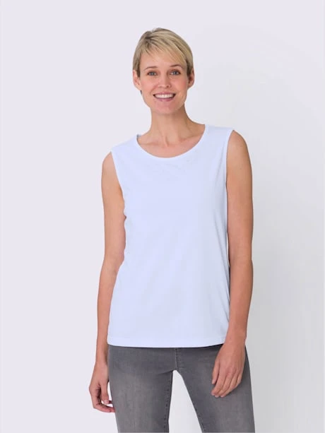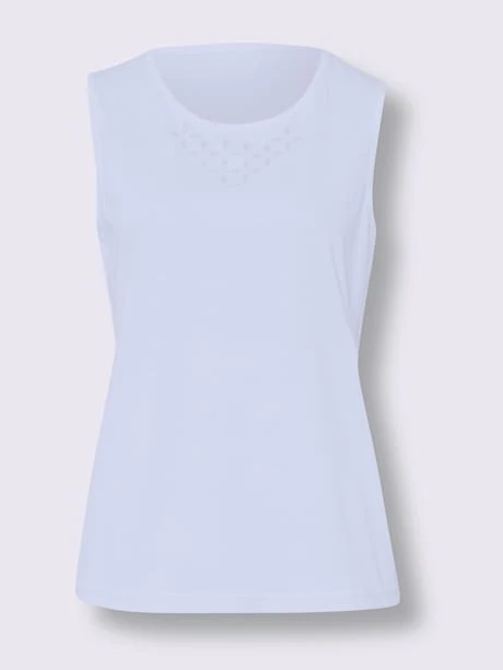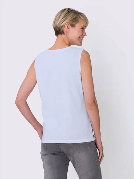 Débardeur facile à associer et agréable à porter avec imprimé brillant couleur argent sous l’encolure ronde.
