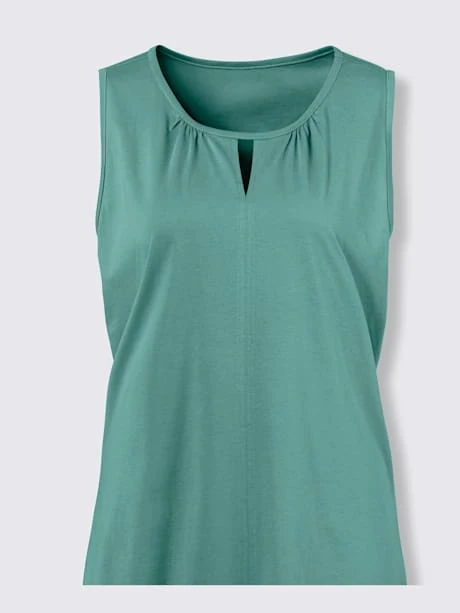Débardeur long léger avec petit V et fronces discrètes à l’encolure ronde passepoilée. Coupe légèrement plus longue et évasée pour dissimuler les petites rondeurs au niveau du ventre, des hanches et des fesses.