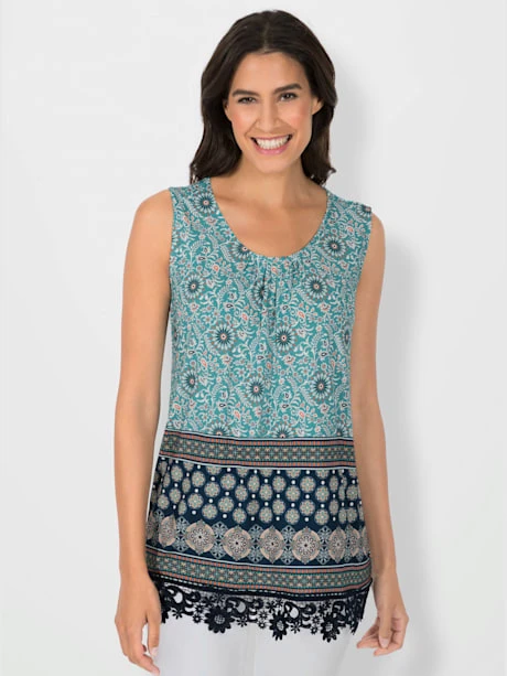 Débardeur au charme irrésistible. Superbe motif et bordure en dentelle à l’ourlet ! Fronces sous l’encolure ronde passepoilée pour une largeur flatteuse.