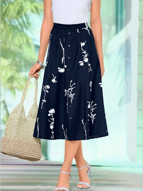 Jupe avec ceinture élastique, patte de boutonnage et fente devant.