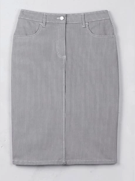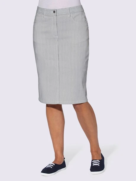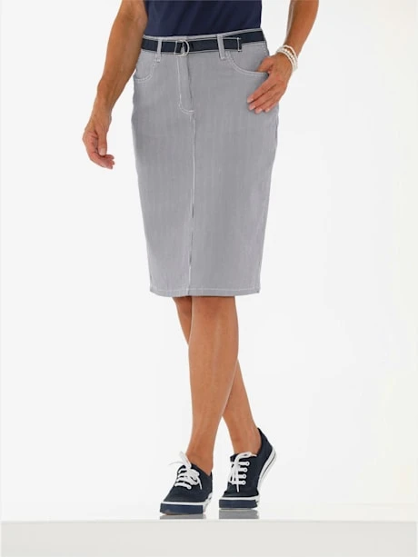 Jupe en jean étroite agréable à porter, coton en qualité extensible. Ceinture gainante à passants. Fermeture à glissière et bouton, 2 poches arrondies devant. Empiècement au dos, 2 poches plaquées et fente. Livrée sans ceinture.