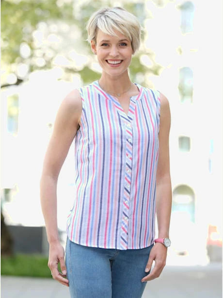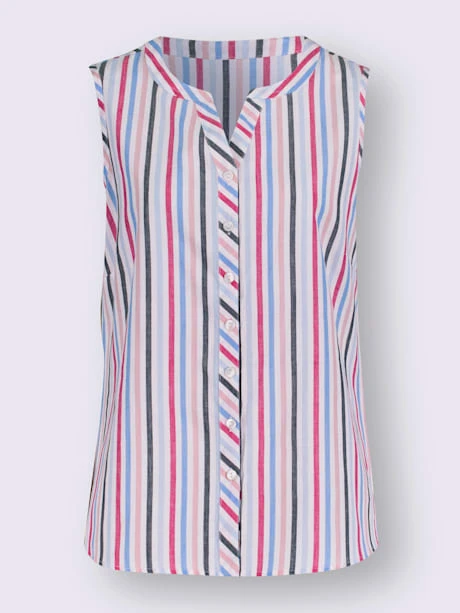 Chemisier sans manches au motif rayé en fils teintés de qualité. Belles finitions avec encolures ronde et en V combinées, patte de boutonnage sur toute la longueur et pinces poitrine structurantes. Ourlet légèrement arrondi.