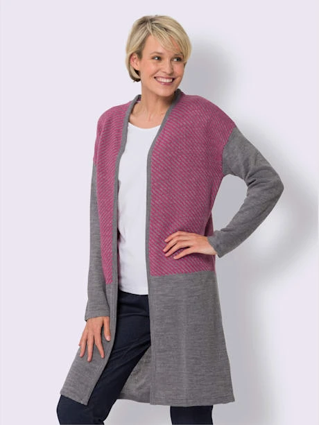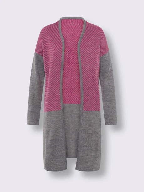 Manteau en tricot pour un confort optimal. Coupe ouverte avec mancherons. Partie supérieure contrastée devant et au dos. Superbe fil chiné.