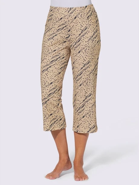 Pantalon de loisirs 7/8 avec imprimé animal et jambes larges décontractées. Ceinture élastique et poches arrondies sur les côtés.
