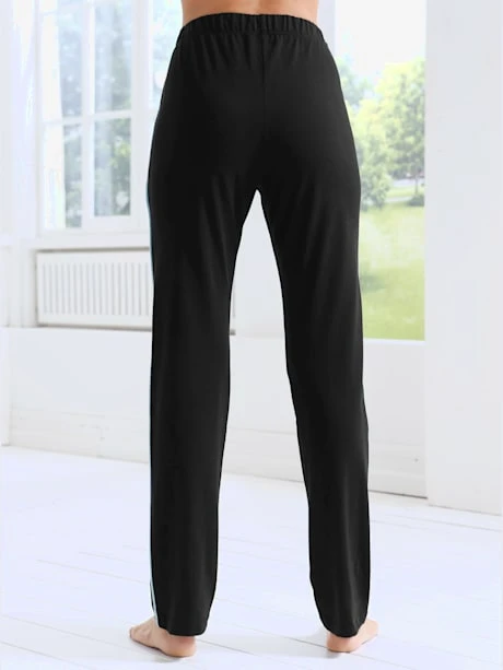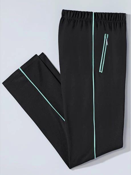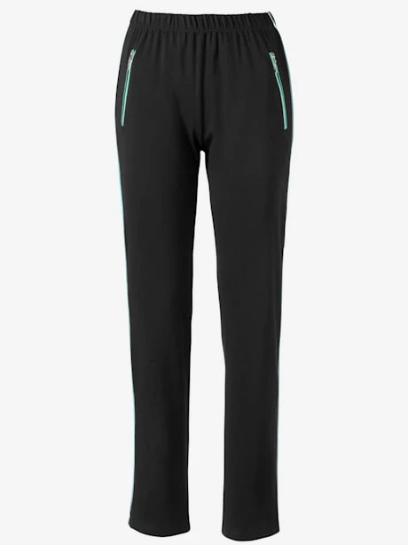 Idéal pour le sport et les moments de détente : Pantalon de loisirs. Ceinture élastique et 2 poches à glissière devant. Le passepoil contrastant et les rayures font tout son charme. Qualité jersey fin.