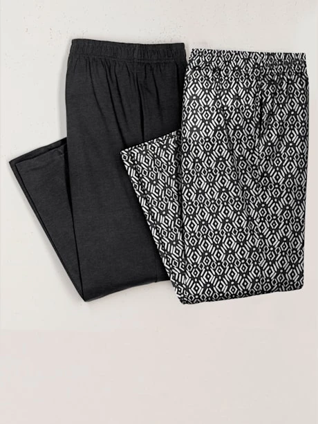 Lot de 2 pantalons de loisirs à petits prix ! 1 uni et 1 imprimé sur toute la surface. Ceinture élastique et poche cousue.