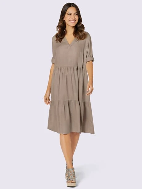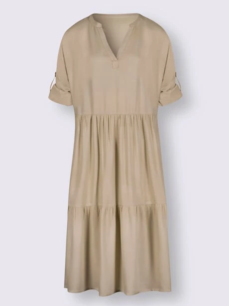 Cette robe étagée est à la fois charmante et décontractée. Encolure ronde avec V ouvert. Manches 3/4 pouvant être retroussées et fixées.