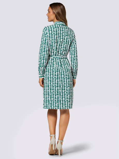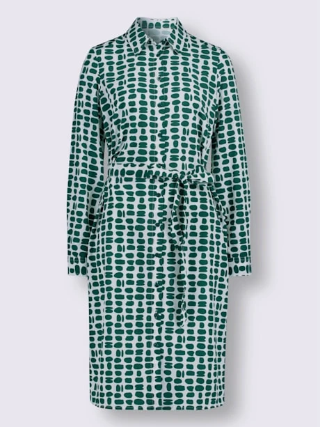 Vous aurez toujours un look élégant grâce à cette robe-chemisier ! Imprimé tendance devant et dos. Pinces poitrine, patte de boutonnage continue, passant de ceinture et liens à nouer. Manches longues à manchettes boutonnées.