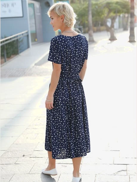 Robe légère pour les chaudes journées d`été. Joli motif floral. Patte de boutonnage devant. Liens fins à nouer au dos pour régler la largeur. Coutures structurantes. Qualité peu froissable très facile à entretenir !