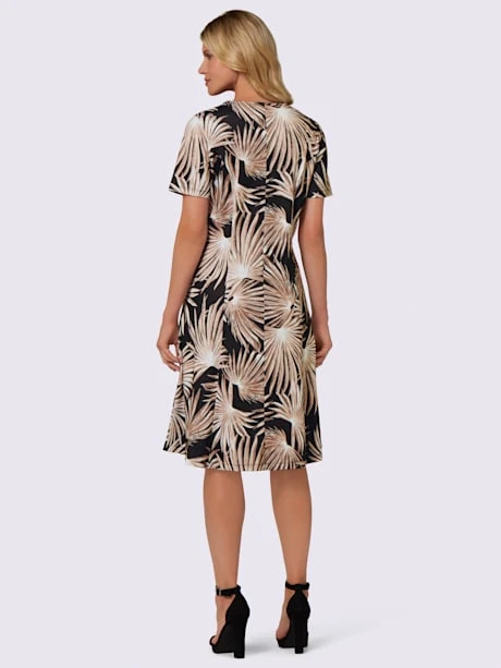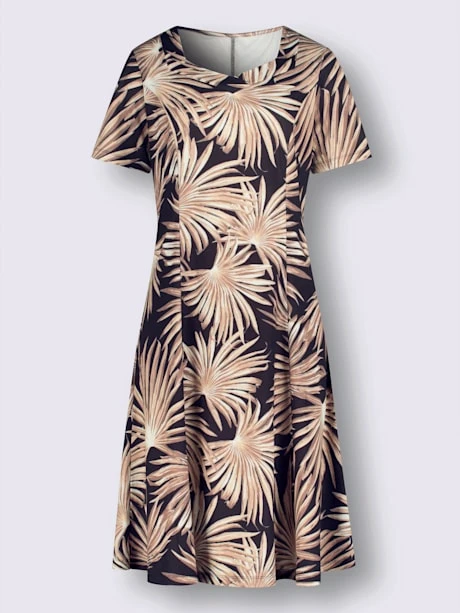 La robe en jersey réalise vos rêves de mode estivale ! Imprimé de feuilles de palmiers devant et dos dans des coloris élégants. Coupe légèrement évasée facile à enfiler avec coutures princesse pour une coupe parfaite.