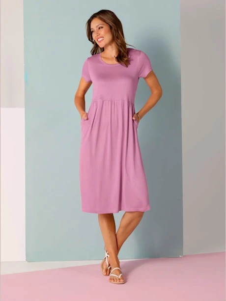 Robe en jersey ultra-confortable. Coupe confortable facile à enfiler, fronces affinantes sous la taille et poches pratiques. Qualité douce et fluide.