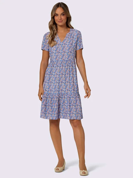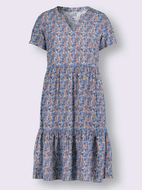 Robe imprimée en qualité viscose tissée douce et fluide, motif floral et coupe affinante. Coupe à paliers avec fronces. Encolure ronde avec V ouvert, pinces poitrine structurantes et manches courtes.
