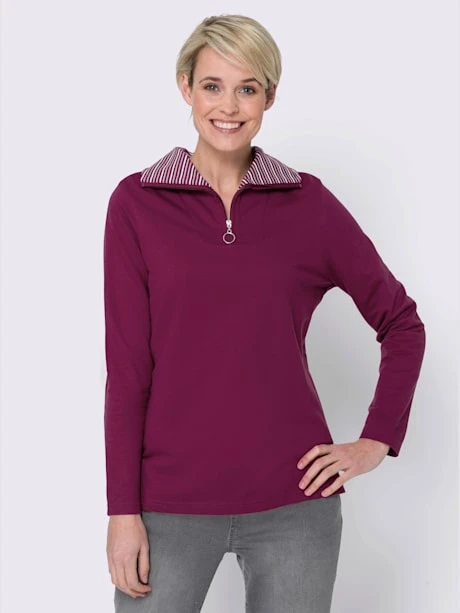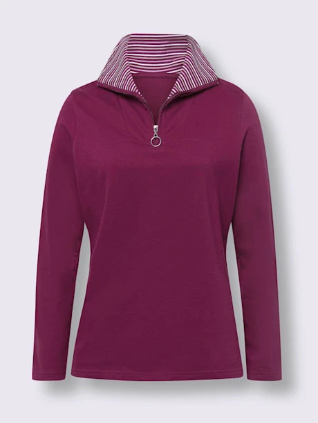 Sweatshirt ultra-confortable ! Col camionneur rayé à l’intérieur avec glissière courte et pendentif en forme d’anneau. Manches longues. Fentes latérales facilitant les mouvements.