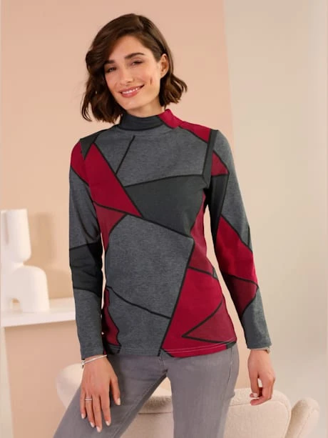 T-shirt au superbe motif graphique. Col montant tendance qui tient bien chaud sans serrer.