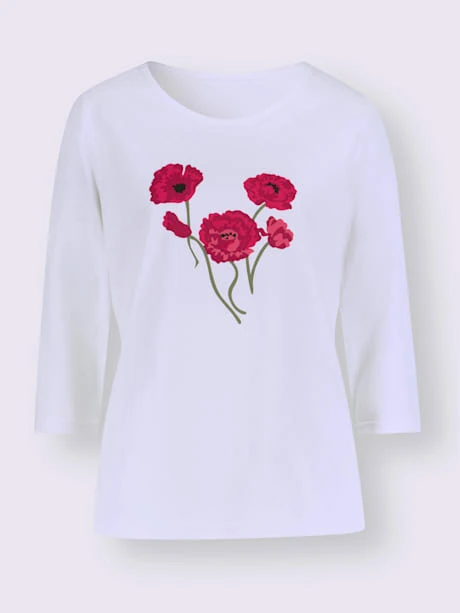 T-shirt à encolure ronde agréable à porter avec superbe imprimé coquelicots devant. Manches 3/4.