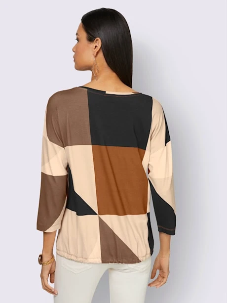 T-shirt large et décontracté en qualité viscose douce et fluide avec motif graphique tendance ! Encolure ronde passepoilée et mancherons tendance. Coulisse sportive avec lien à nouer à l’ourlet. Manches 3/4.