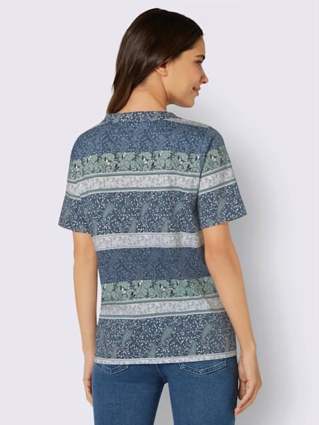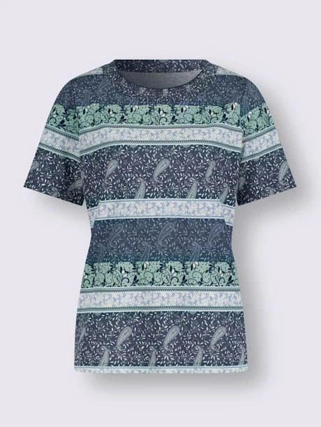 T-shirt à manches courtes au motif paisley revisité. Encolure ronde smockée tendance. Manches courtes, ourlet droit.