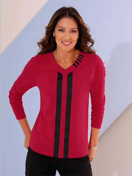 L’encolure en V et les rayures sur le devant du T-shirt à manches longues affinent habilement le haut du corps. Détails rayés à l’encolure.