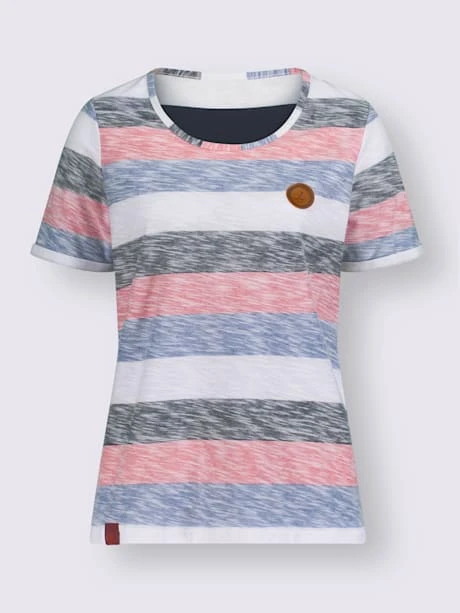 Aspect ultra-moderne ! T-shirt à rayures multicolores avec superbe fil flammé. Encolure ronde passepoilée. Logo décoratif en synthétique sur la poitrine et sur l’ourlet.