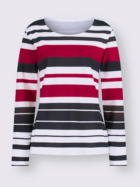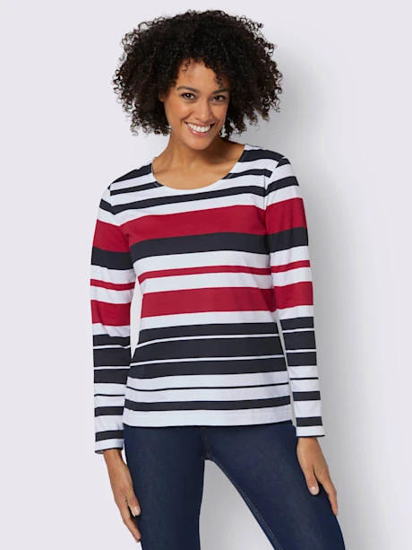 T-shirt à rayures marines en lin. Encolure ronde et manches longues. Qualité agréable à porter.