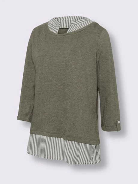 Ultra-tendance ! T-shirt 2 en 1 au superbe aspect chiné. Tissu chemisier rayé au niveau de l’encolure ronde et de l’ourlet pour un joli look superposé. Manches 3/4 avec revers fixe, bride et bouton.