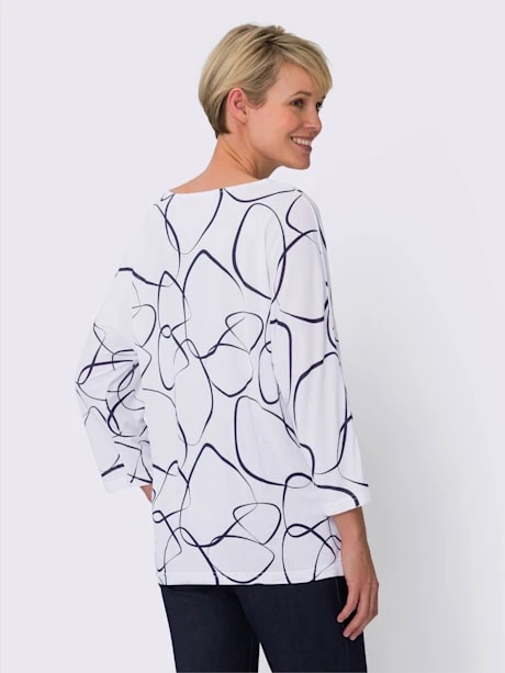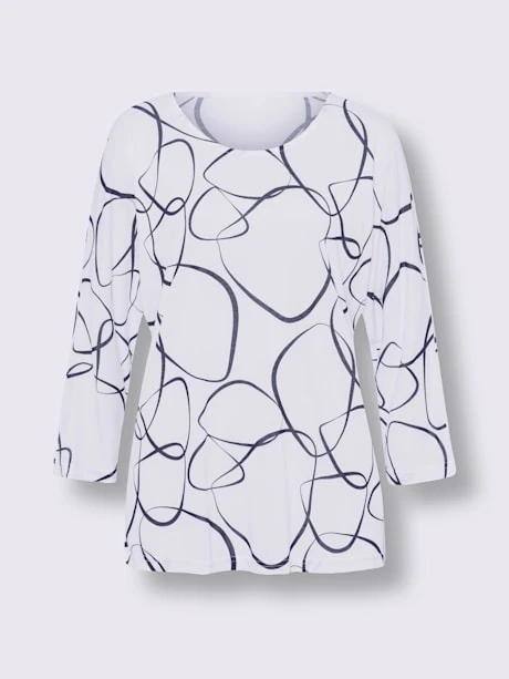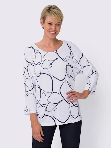 T-shirt de loisirs orné d’un grand imprimé graphique sur toute la surface. Encolure ronde, mancherons décontractés et manches chauve-souris 3/4.