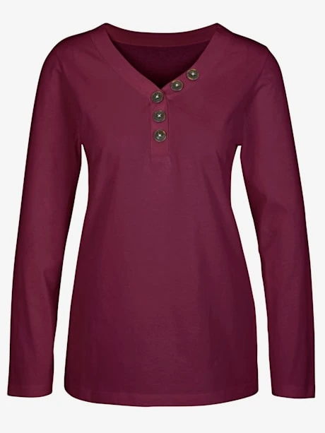 T-shirt agréable à porter, boutons imitation bois sur l`encolure en V et la fausse patte de boutonnage.