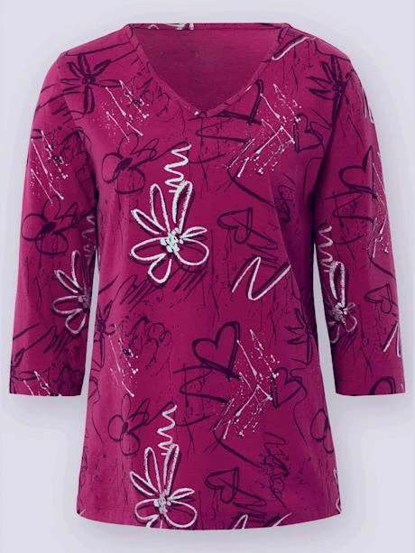 Pour briller tous les jours : T-shirt à imprimé floral et petits coeurs orné d`un imprimé sur film couleur argent. Encolure en V et manches 3/4.