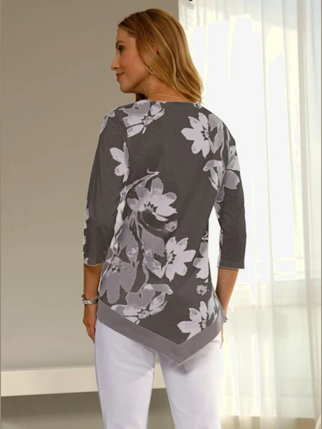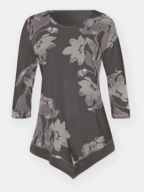 T-shirt flatteur ! Coupe légèrement évasée pour un tombé décontracté qui dissimule les petites rondeurs. Ourlet en pointe affinant. Imprimé floral, encolure ronde et manches 3/4.