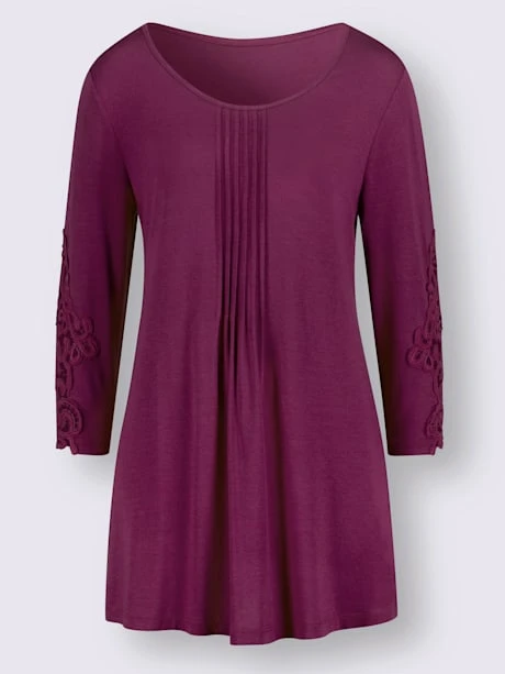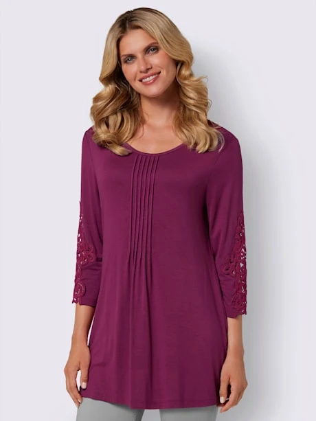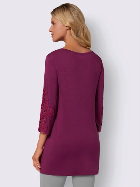Pour tous les jours : T-shirt long en qualité viscose fluide. Nervures décoratives sous l’encolure ronde pour une largeur affinante. Empiècement dentelle aux manches 3/4.